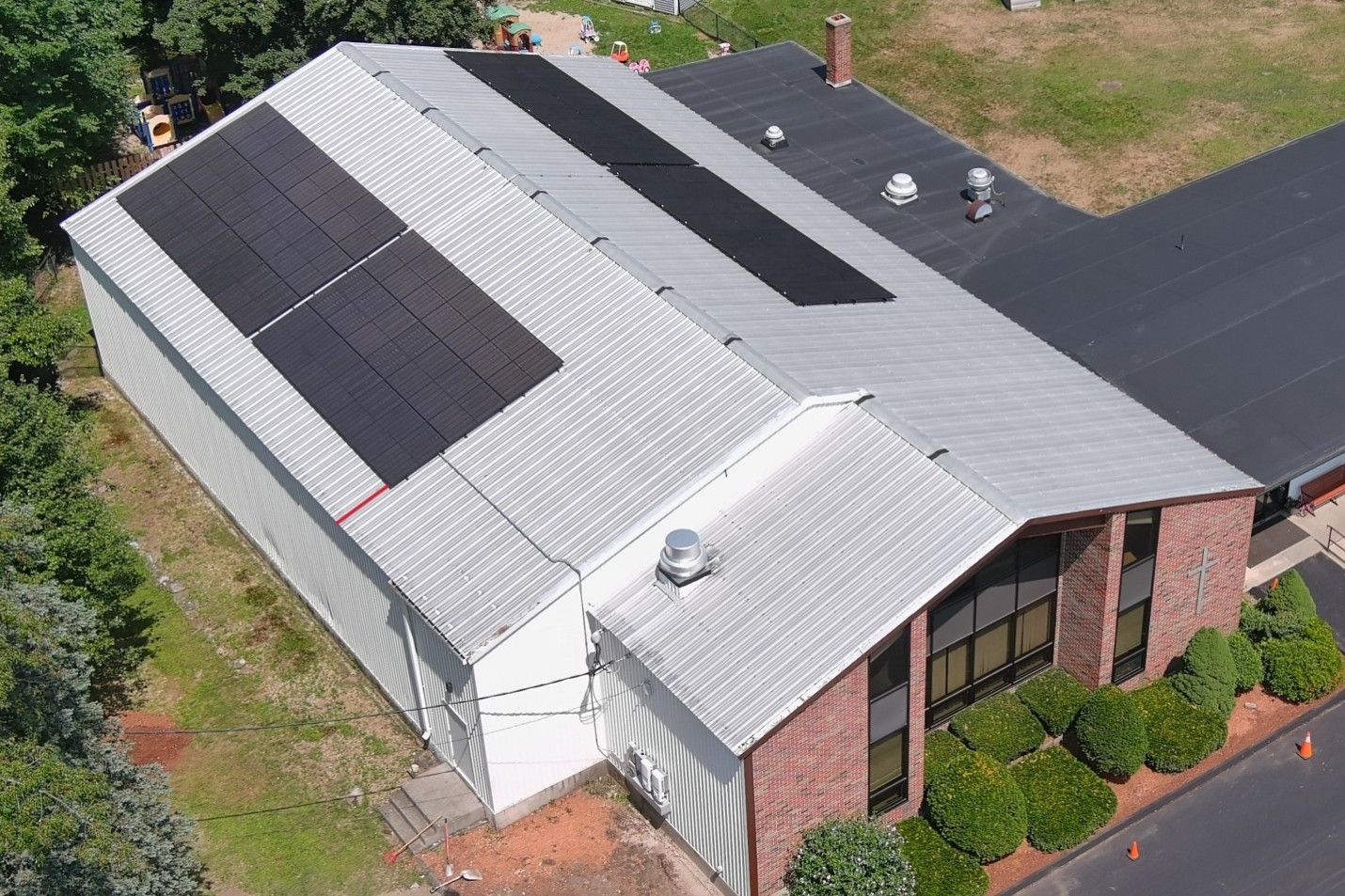 One of the biggest projects in our campaign, we're installing solar panels on both sides of the gym roof. We've contracted with SunBug Solar, which is now owned by ReVision energy, to do this work. All of the panels are installed and have passed inspections, and our system went live in early October. Right now they're producing lots of clean electricity and providing for our building's needs (including the new heat pump systems). This is helping us to reduce both our carbon footprint and our utility costs!